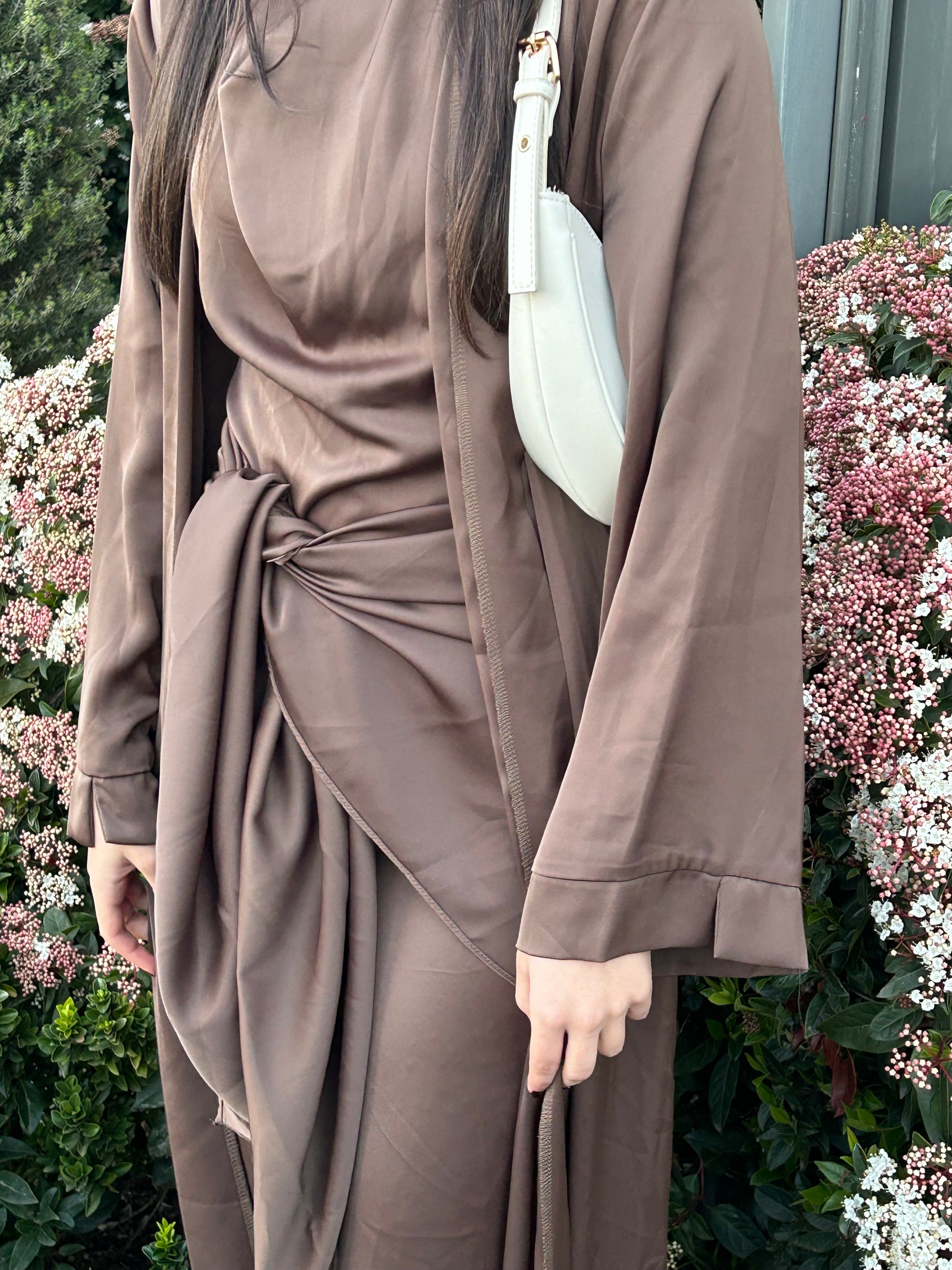 A timeless two-piece abaya designed in a rich olive-brown shade, perfect for the freshness of spring. The set features a flowing silhouette with a versatile tie-up design — wear it loose for an airy, effortless look or tie it up for a more defined style. Paired with a matching inner, it’s an elegant choice for both casual days and special occasions.